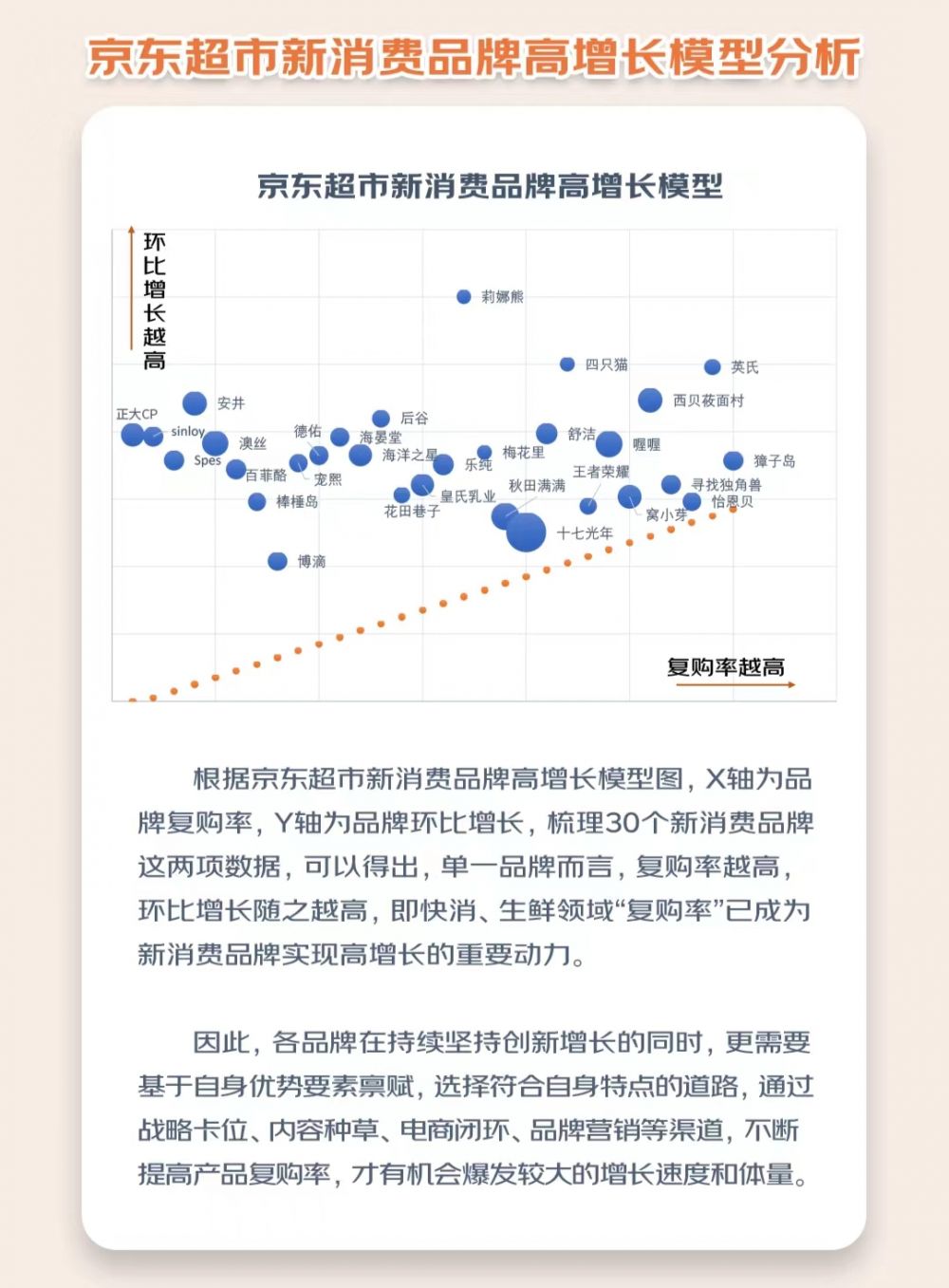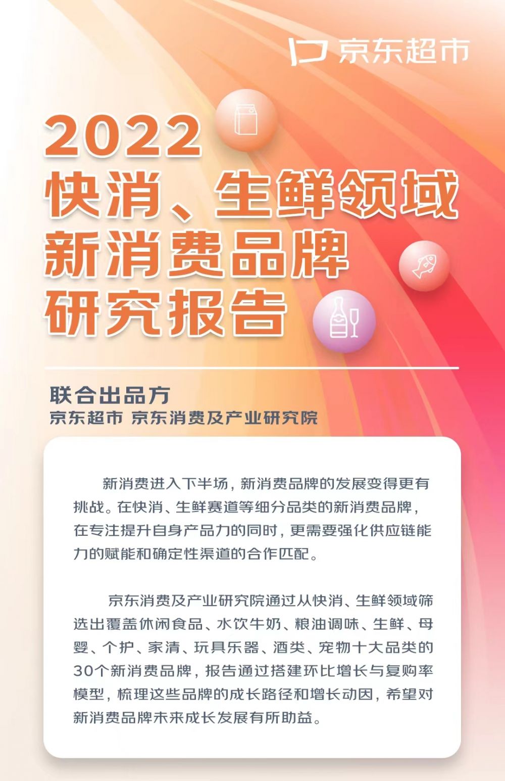京东超市本次发布的报告,是由京东消费及产业研究院从快消、生鲜领域筛选出覆盖休闲食品、水饮牛奶、粮油调味、生鲜、母婴、个护、家清、玩具乐器、酒类、宠物十大品类的30个新消费品牌,通过搭建自今年Q2以来的环比增长与复购率模型,梳理出了新消费品牌的成长路径和增长动因,给新消费品牌带来的最权威增长参考。