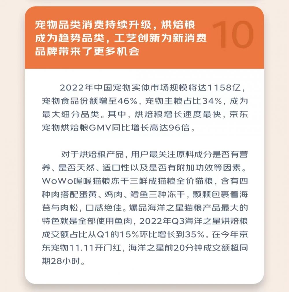 在宠物品类中,烘焙粮增长速度最快,京东宠物烘焙粮GMV同比增长高达96倍,是颇具前景的蓝海市场。在京东上,爆品海洋之星猫粮产品最大的特色就是全部使用鱼肉,2022年Q3海洋之星烘焙粮成交额占比从Q1的15%环比增长到35%。在今年京东宠物11.11开门红,海洋之星前20分钟成交额超同期28小时。