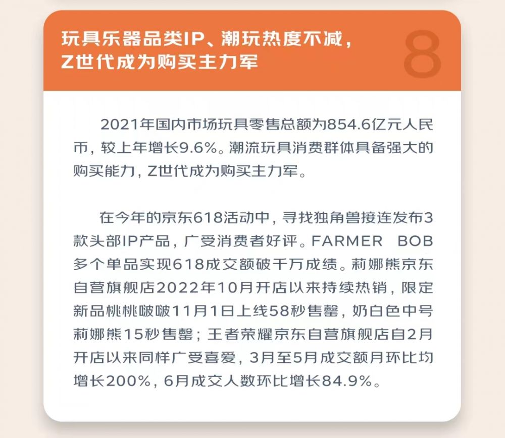 在玩具乐器市场中,潮流玩具消费群体具备强大的购买能力,Z世代成为购买主力军。FARMER BOB海岛系列、夏日逐梦福袋以及RiCO梦境系列等产品的多个单品实现京东618销售破千万的成绩。