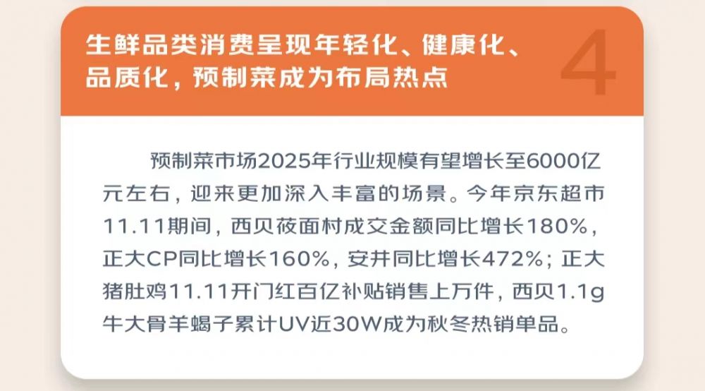 在生鲜品类消费中,品质化、精细化、高性价比、便携化已成为新的消费趋势,尤其是预制菜行业在其中增速明显。目前,京东超市已率先宣布把预制菜纳入战略扶持品类,并计划在未来三年,将扶持20个销售过亿元的预制菜品牌,5个销售过五亿元的预制菜品牌。
