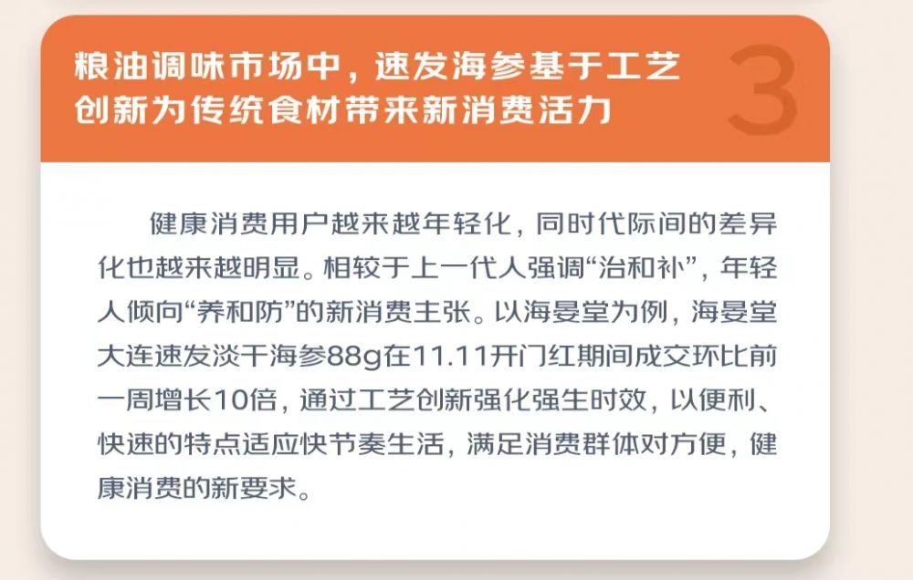 在粮油调味市场中,海晏堂、棒棰岛等品牌基于工艺创新的速发海参为传统食材带来了全新活力。海晏堂大连速发淡干海参通过工艺创新强化强生时效,满足消费群体对方便、健康消费的新要求,在京东11.11开门红期间,销售环比前一周增长10倍。