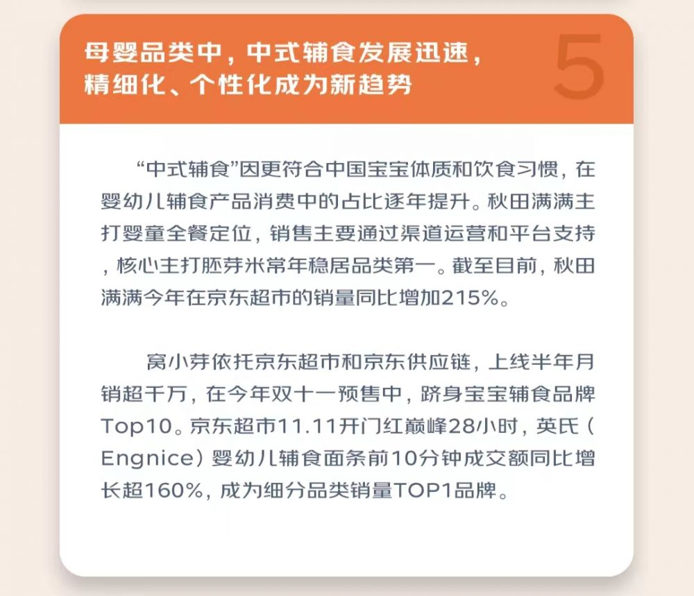 在母婴品类中,“中式辅食”因更符合中国宝宝体质和饮食习惯,在婴幼儿辅食产品消费中的占比逐年提升。比如,窝小芽主打的“一周系列”辅食产品,依托京东超市和京东的供应链,上线半年月销即超千万。