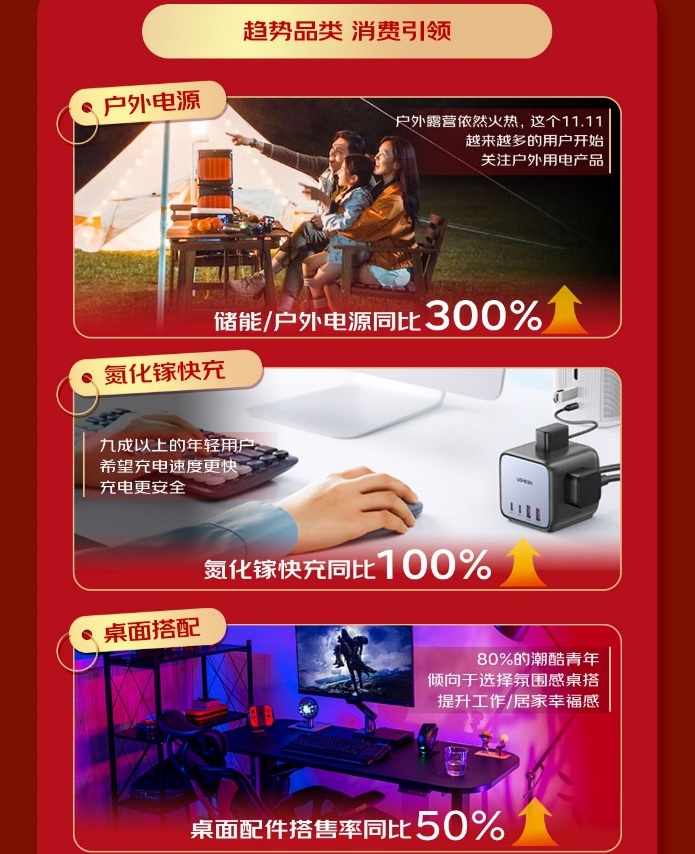 随着户外露营成为度假新姿势,越来越多的用户开始关注户外用电产品,储能/户外电源成交额同比增长300%。数据显示,九成以上的年轻用户希望充电速度更快、充电更安全,氮化镓快充同比实现成交额100%的同比增长。而针对用户的个性化搭配需求,桌面配件搭售率同比增长50%。