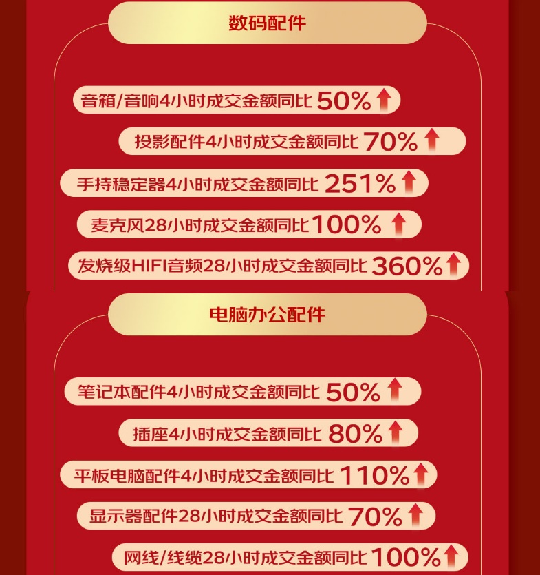 而作为帮助提升生产力的电脑办公配件,平板电脑配件4小时成交额同比增长110%,网线/线缆也达成28小时成交额同比增长100%的好成绩。