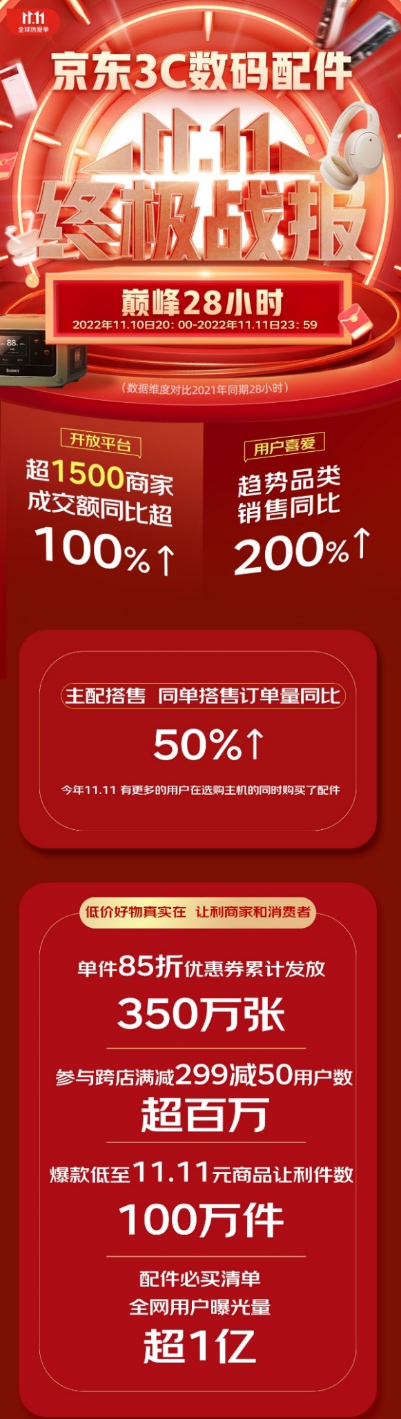 自11月10日晚8点京东11.11“巅峰28小时”正式开启至11月11日晚23:59,用户的消费热情被充分激发,3C数码配件创下最新佳绩。其中,单件85折优惠券累计发放350万张;参与跨店满减299减50的用户数超百万;爆款低至11.11元商品让利件数100万件,配件必买清单全网用户曝光量超1亿; 开放平台超1500商家成交额同比增长超100% ;备受用户喜爱的趋势品类成交额也同比增长200%。凭借专业的品质好物与贴心的服务保障,以及更简单、更大力度的优惠举措,京东将真实在的低价好物,让利给商家和消费者,提升用户消费体验的同时帮助品牌和商家创造新纪录,成为实体经济高质量增长的重要增量场。