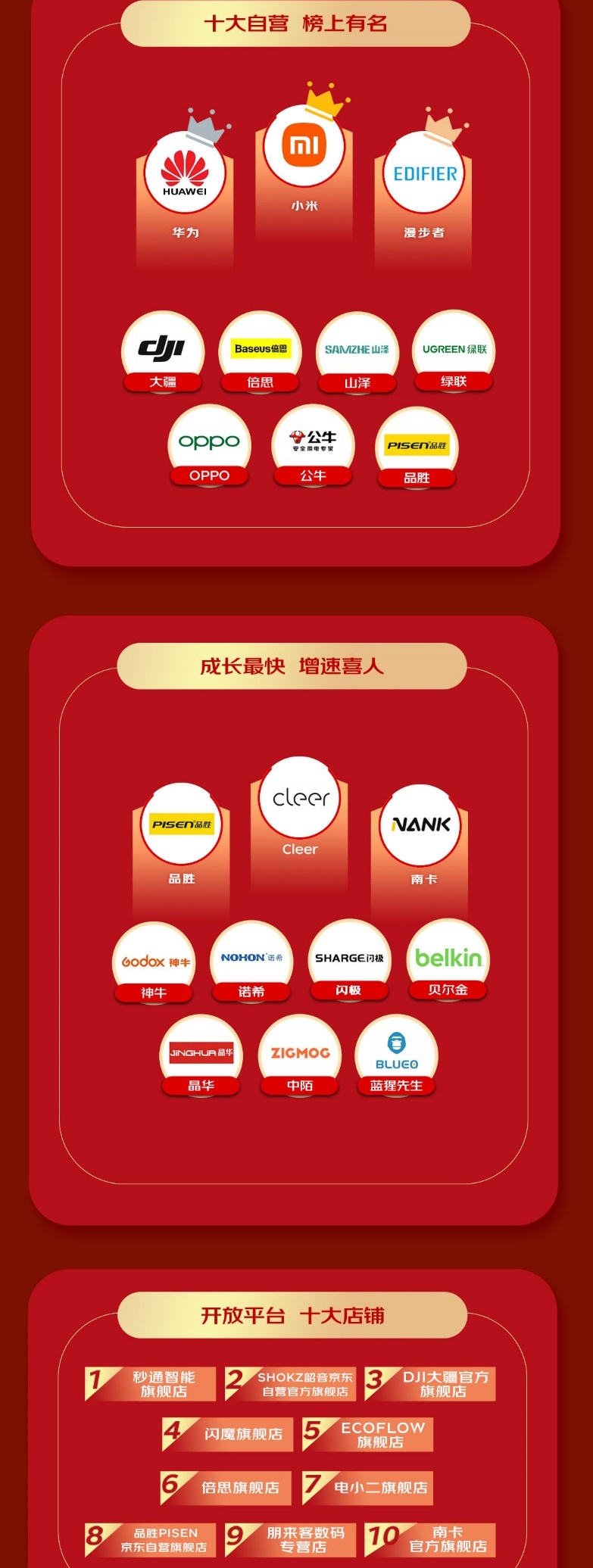 通过发挥数实融合优势,京东3C数码配件成为第三方平台商家高质量增长的有力推手。秒通智能旗舰店、韶音京东自营官方旗舰店、大疆官方旗舰店等成为开放平台十大店铺,Cleer、南卡、诺希、贝尔金等则是今年京东11.11期间成长最快的品牌,华为、小米、漫步者等十大自营品牌也迎来销量高增长,增速喜人。