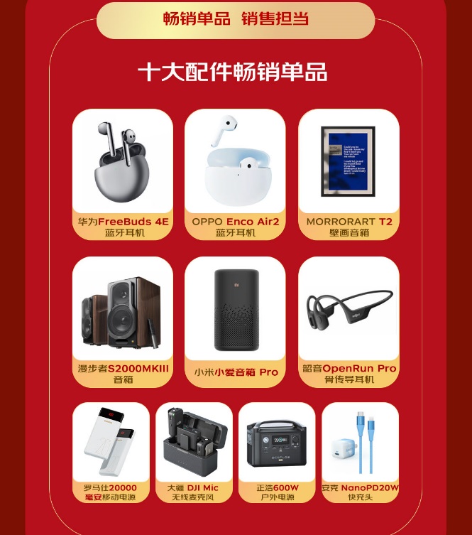同时,手机、数码、电脑办公等品类配件迎来销量新高,华为FreeBuds 4E蓝牙耳机、MORRORART T2壁画音箱、大疆DJI MIC无线麦克风等更是作为十大配件畅销单品,成为销售担当,赢得众多消费者的青睐。