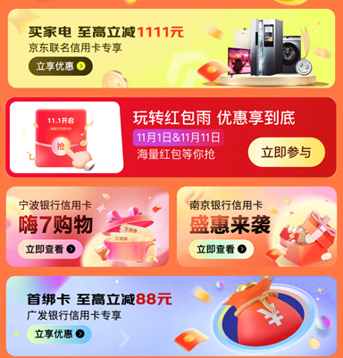 11.11期间,京东联名信用卡携手中国农业银行、华夏银行、浦发银行、中信银行、中原银行、汉口银行、河北银行等60+银行推出多种支付优惠活动。不仅有红包雨、支付券秒杀、奖章加速等多种符合用户消费需求的优惠活动,还有支付立减单笔最高1111元锦鲤大奖。各式各样的福利让更多消费者被京东联名信用卡圈粉种草,今年11.11京东联名信用卡全场景交易额增长182%,众多用户享受到了单笔立减1111元的超级福利。