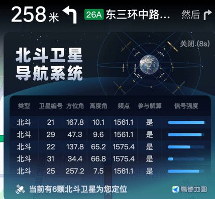 驱动中国2022年11月17日消息,近日高德地图上线了北斗卫星定位查询系统,用户在定位导航时可查看当前所调 用的北斗卫星数量,以及具体编号、方位角、高度角、频点、信号强度相关详细信息。