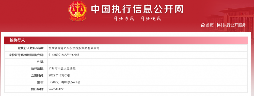 驱动中国2022年12月8日消息,中国执行信息公开网显示,12月5日,恒大新能源汽车投资控股集团有限公司、恒大恒驰新能源汽车(上海)有限公司、恒大风驰动力科技(深圳)有限公司、恒大集团有限公司新增一则被执行人信息,执行标的2.6亿余元,执行法院为广州市中级人民法院。