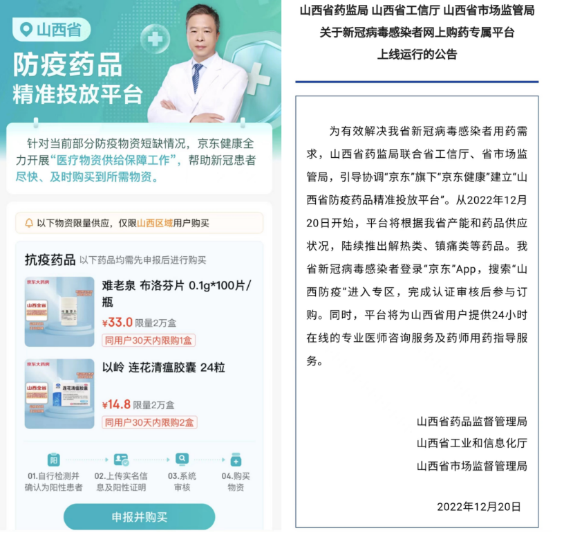 12月19日,京东健康向河北省定向投放了首批保供物资,包括布洛芬、连花清瘟、抗原检测试剂盒等紧缺药品及防护物资,累计165万人份;河北全省范围内新冠病毒感染者可凭阳性检测结果在线购买。12月19日,京东健康山西省防疫药品精准投放平台上线,首批共投放布洛芬36万盒、连花清瘟20万盒。