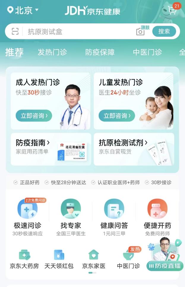 近期,在国务院联防联控机制《关于做好新冠肺炎互联网医疗服务的通知》等政策要求和民众线上就医需求驱动下,针对新冠感染者线上问诊的特点,京东健康互联网医院推出“发热门诊”服务,为用户提供新冠病毒感染后的在线问诊、开具药方、购买药品、用药指导等服务。此举大大提升了患者医药服务的可及性,有效缓解了线下医疗机构的压力。