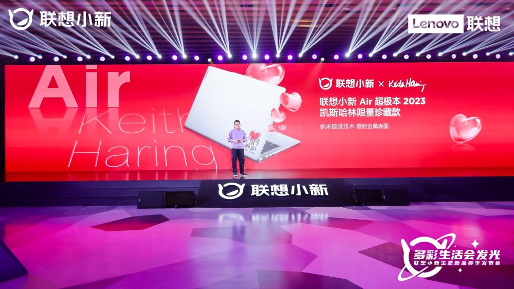 本次联想小新Air 14 2023还特别推出了与涂鸦大师凯斯哈林联名的全球限量珍藏款。纳米镀膜和七彩镭射工艺,让凯斯哈林的爱心系列作品在联想小新Air 14 2023金属表面,绽放出梦幻般的光芒。