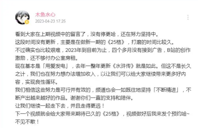 驱动中国2023年4月24日消息,近日,据媒体报道,拥有1020.6万粉丝的B站影视UP主“木鱼水心”发布动态回应停更传言,称四个多月没有接到广告,流量激励不够支付房租。