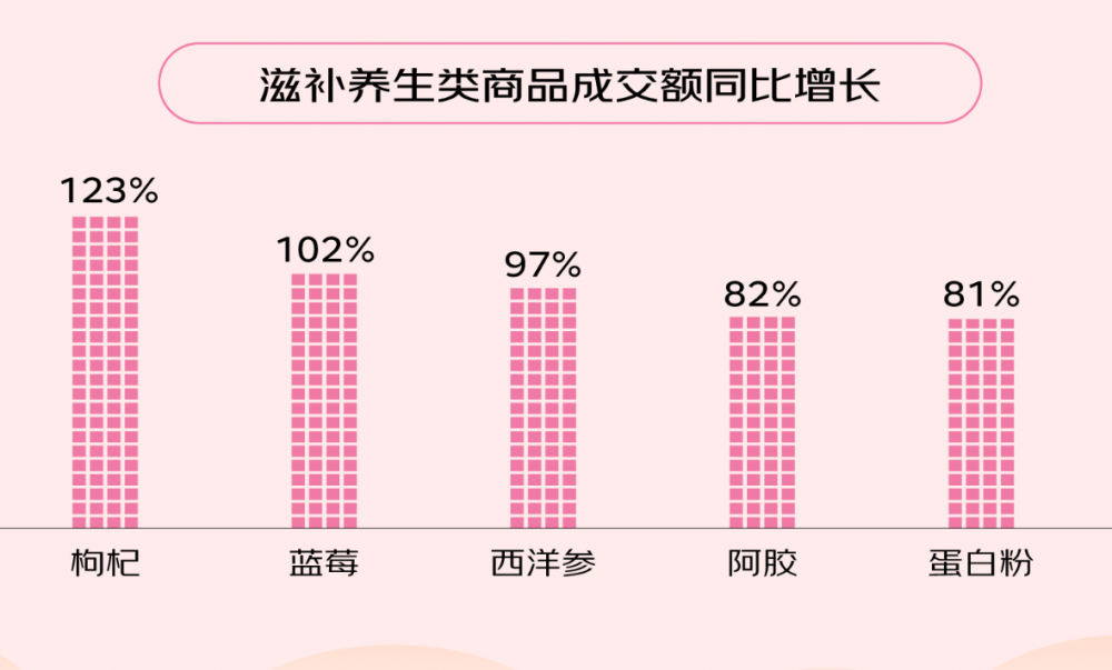 * 滋补养生类礼盒消费明显增长。枸杞、蓝莓、西洋参成交额同比增长近100%,阿胶、蛋白粉消费增长超过80%。