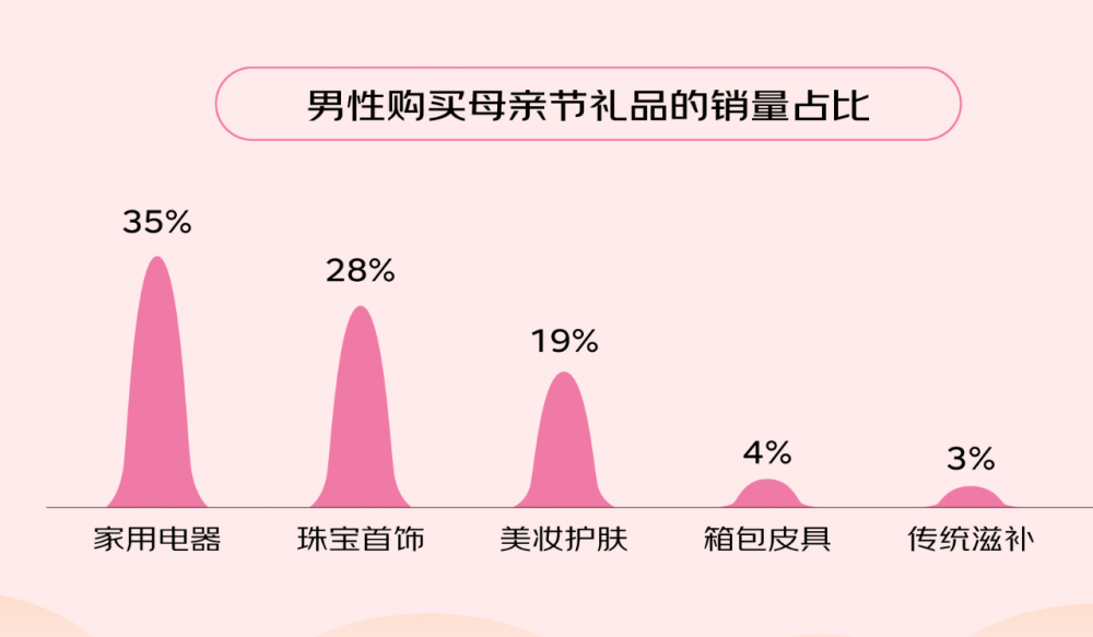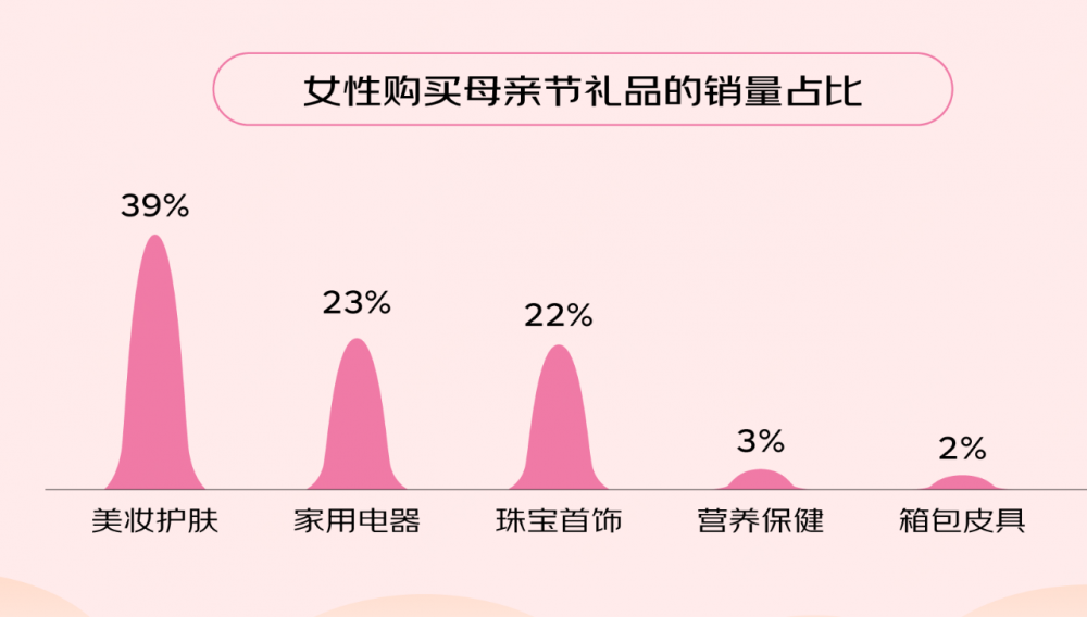 *在品类选择上,男性爱给母亲买家电,销量占比35%;女性爱送母亲化妆品,销量占比39%。