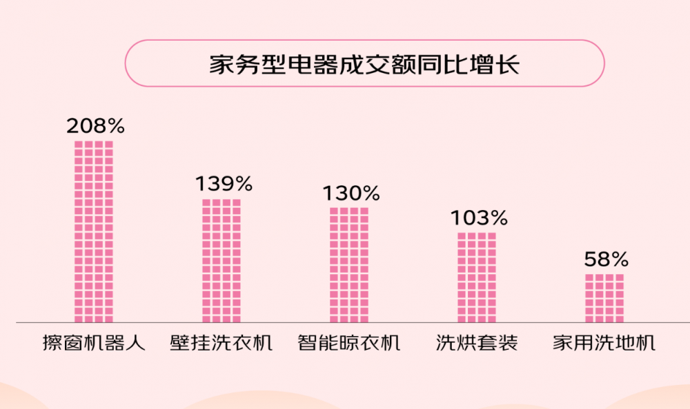 * 家务型电器消费增长超100%。擦窗机器人成交额同比增长2倍,壁挂洗衣机、智能晾衣机消费翻番。