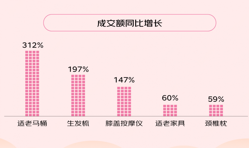 * 儿女们关注到母亲的生活细节。适老马桶成交额同比增长超过3倍,生发梳、膝盖按摩仪消费分别增长197%、147%。