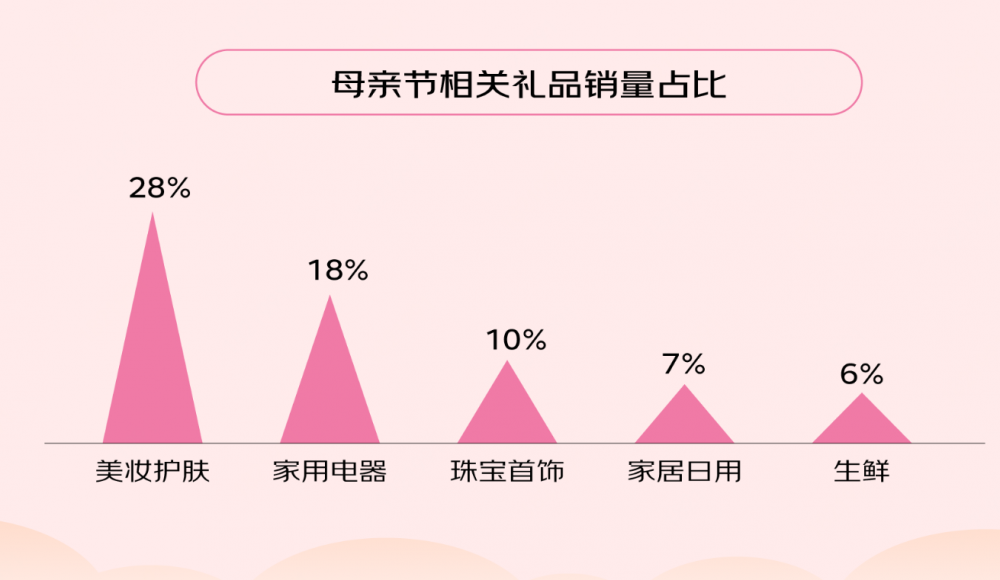 * 为母亲选礼物最首要的诉求是“实用”。美妆护肤品销量占比近3成,是母亲节前最畅销的礼品;家电、珠宝首饰销量占比18%、10%。