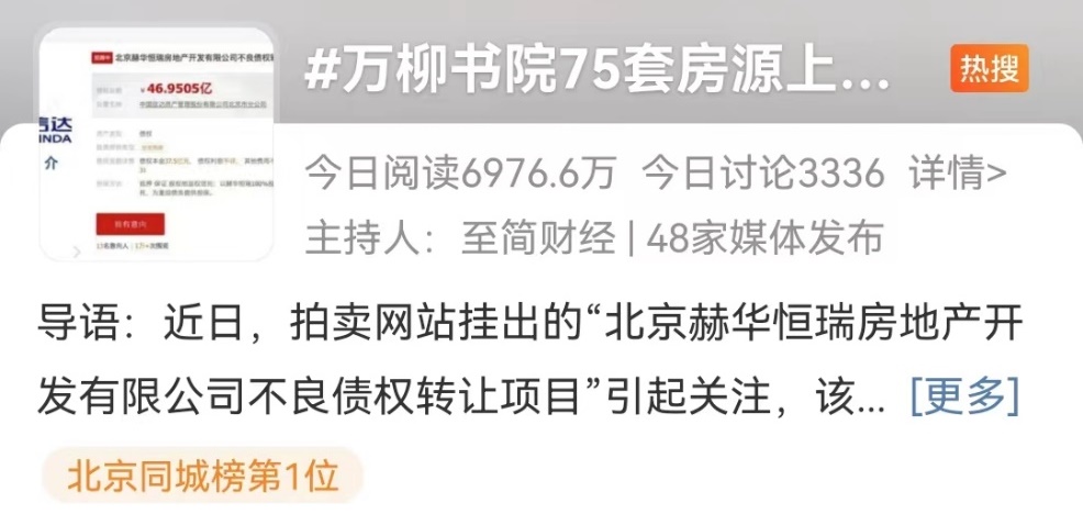 而近日,万柳书院再次进入网友视线,#万柳书院75套房源上架抵押拍卖# 的微博话题最高登录至微博热搜11位,北京同城榜第一位。不过半年之久,万柳书院再次登上热搜,竟是因多套房屋沦为抵押物,实在是令人唏嘘。