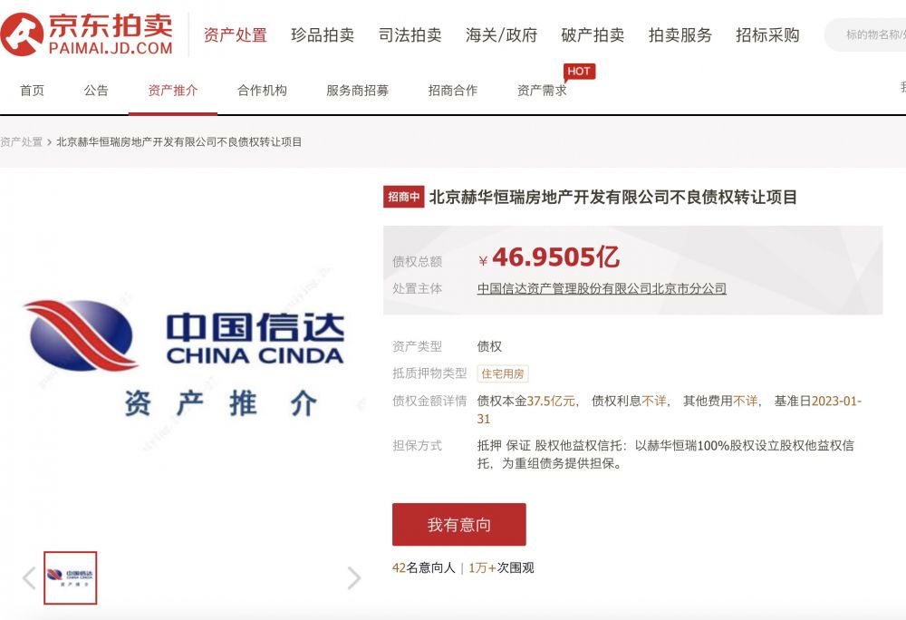 小编从京东拍卖上看到,“北京赫华恒瑞房地产开发有限公司不良债权转让项目”的抵押物,包括北京万柳书院2-9号楼、12-15号楼在内的75套未售 住宅、商业服务用房以及车位 ,项目的处置主体是中国信达资产管理股份有限公司北京市分公司。