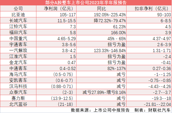 驱动中国2023年7月18日消息,近日,据同花顺iFinD统计,共有10家车企预计完成盈利,占比62.5%,其中,比亚迪盈利能力最强,预计报告期内盈利105-117亿元,超其他15家公司同期净利润之和;6家车企亏损,但普遍预计亏损收窄,北汽蓝谷预计亏损额度最大。