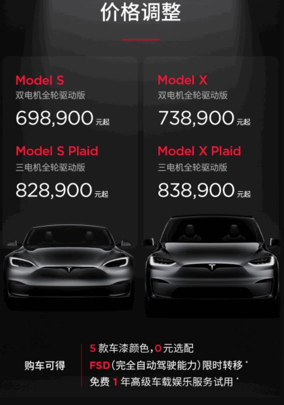 驱动中国2023年9月1日消息,特斯拉中国宣布对Model S和Model X进行价格调整,全新Model S起售价为69.89万元,全新Model X起售价为73.89万元。与此前相比,双电机版起售价分别下降了5.51万元和9.8万元。此外,购车可免费选配5款车身颜色,限时转移FSD软件包,并免费试用一年的高级车载娱乐服务。