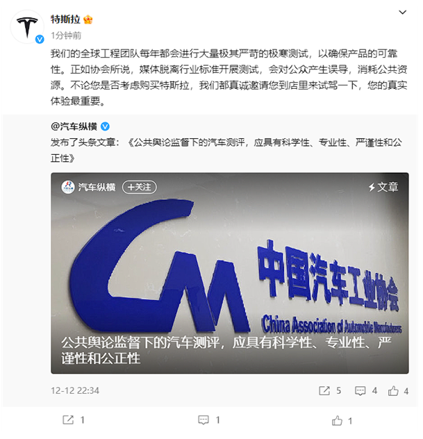 文章指出,正如中国汽车工业协会所说,媒体脱离行业标准开展测试,会对公众产生误导,消耗公共资源。特斯拉表示:“不论您是否考虑购买特斯拉,我们都真诚邀请您到店里来试驾一下,您的真实体验最重要。”