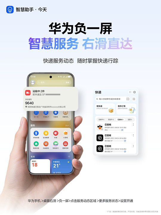 无论是查看日常待办,处理日常工作行程,还是做出行规划,安排周末休闲娱乐,华为负一屏都能提供更智慧的解决方案。依托实时更新的动态服务卡片,重要行程、快递物流、天气等信息一目了然。