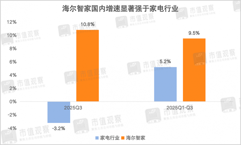 但从实际数据来看,在国内Q3大盘下滑3.2%的背景下,海尔智家Q3国内收入同比增长10.8%,还好于第二季度;前三季度海尔国内增长9.5%,显著快于行业大盘。可见,即便遭遇国补退坡,海尔智家依然实现了逆势增长,具备开逆风船的实力。