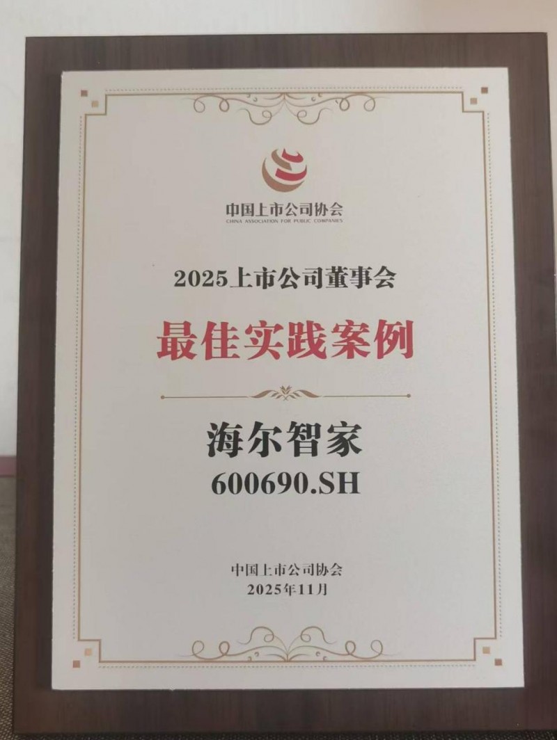 11月18日,中国上市公司协会第三届理事会第六会议在北京召开,会上正式发布了“2025上市公司董事会最佳实践创建活动”评选结果。其中,海尔智家荣获“2025上市公司董事会最佳实践奖”。
