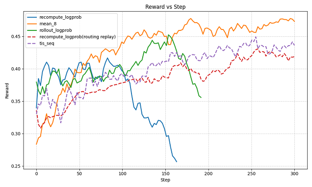 当前业界大多把模型在RL训练时出现reward 崩溃的问题归因于“训推不一致”。然而,我们的实验发现:当前阶段 RL 训练不稳定的主导因素并不是训推不一致,而是采样噪声(Sampling Noise)本身。当我们显式抑制噪声强度后,即使存在明显的训推差异,训练依旧保持稳定,并能获得更快的收敛速度。