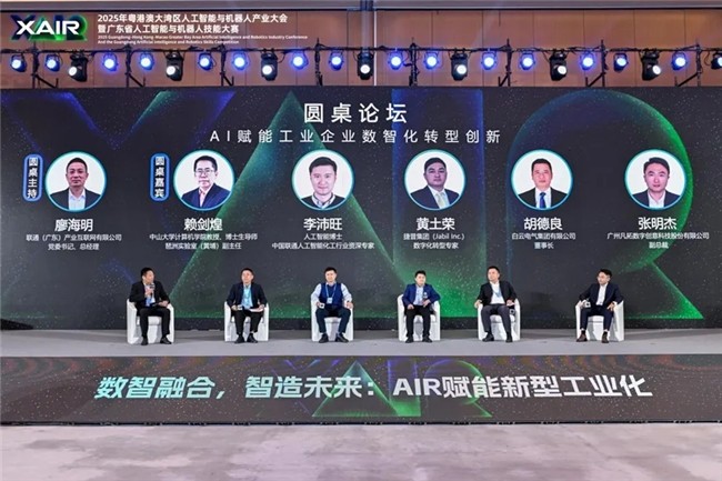 圆桌论坛环节,在联通(广东)产业互联网有限公司党委书记、总经理廖海明的主持下,中山大学计算机学院赖剑煌教授、中国联通人工智能化工行业资深专家李沛旺博士、捷普集团数字化转型专家黄土荣、白云电气集团有限公司董事长胡德良、广州凡拓数字创意科技股份有限公司副总裁张明杰围绕“AI赋能工业企业数智化转型创新”议题展开讨论,为制造企业推进智能化转型提供了系统化思路与实践启示。