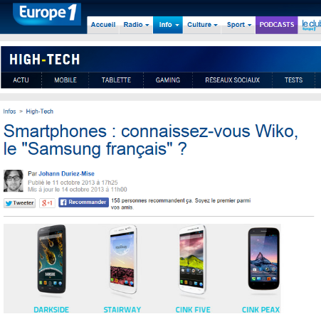 (欧洲媒体Europe1 报道:智能手机品牌WIKO力追三星)
