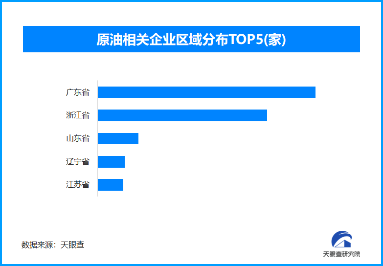 天眼查专业版数据显示,截至目前我国现存在业、存续状态的原油相关企业超2.8万家。从区域分布来看,广东省、浙江省原油相关企业数量位居前列,两个省市数量总和超过1.8万余家,占企业总数的64.42%。