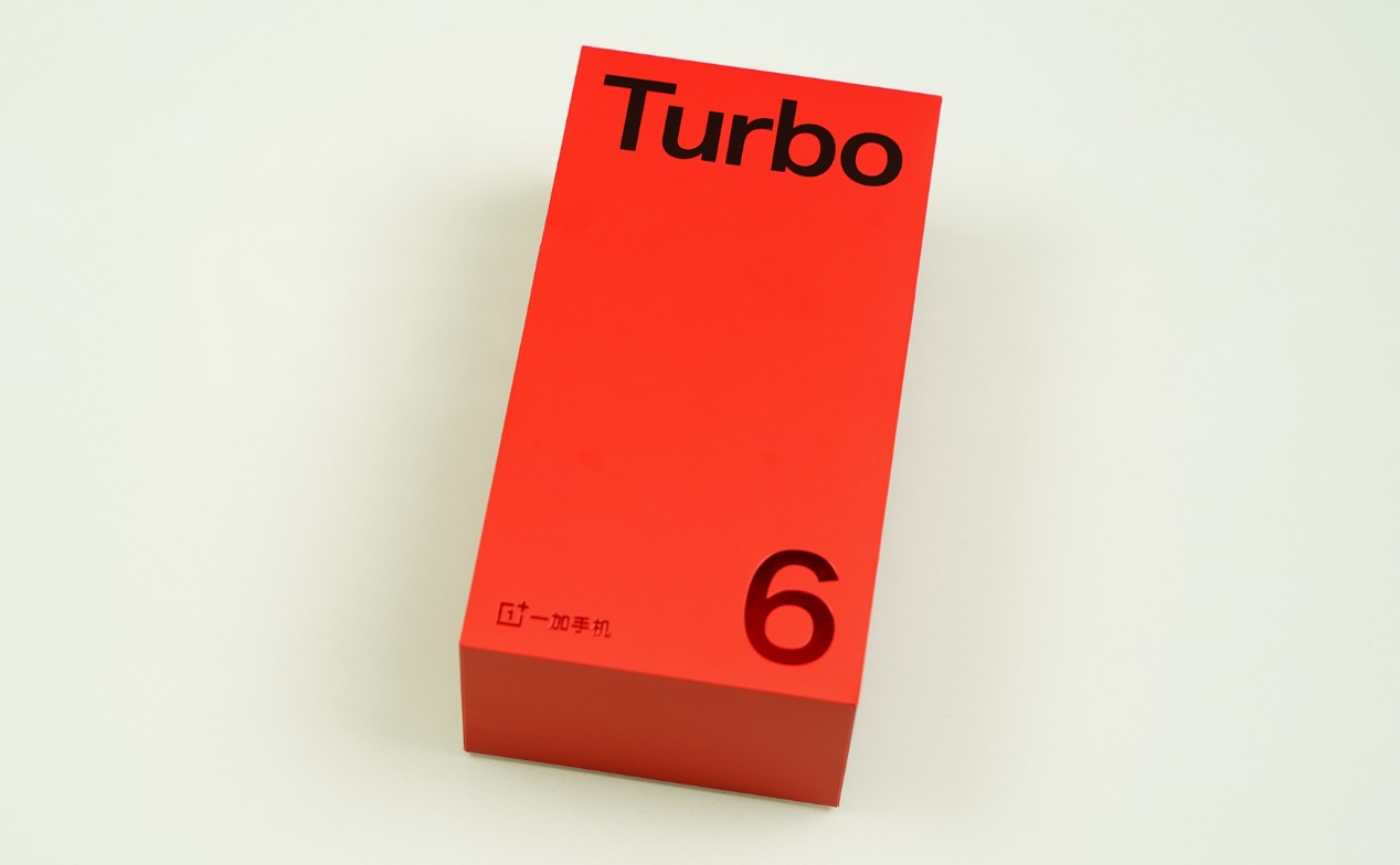 拿到全新一加Turbo6,外包装依旧是一加经典的红色包装盒,顶部大大的“Turbo”字样清晰明了,展示一加 Turbo 全新系列的不同。