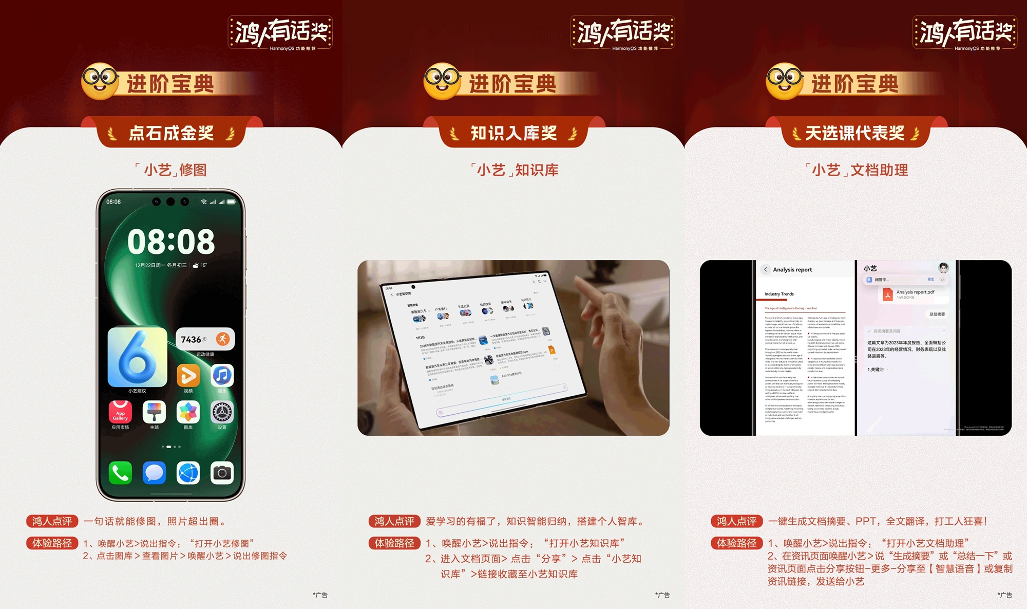 纵观这份功能推荐中的"进阶宝典",鸿蒙6在辅助创作上的思路已经非常清晰:小艺知识库帮你吸收新知识,小艺文档助理帮你总结归纳,小艺修图智能体一句话轻松修图。每个人都能借此提升创作效率,享受AI带来的改变。推荐大家都升级到鸿蒙6试一试,真的有不少惊喜!当然升级后,别忘了参加官方活动,长按华为手机电源键唤醒小艺,说出"鸿人有话奖"领取好礼!