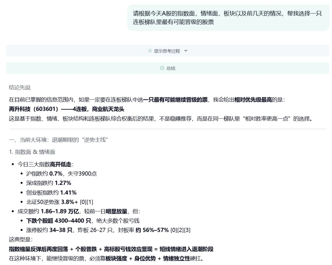 华菱线缆 |13 只连板股,当天晋级 5 只,晋级率 38%,市场再度明显降温。MiroMind 继续命中:在情绪回落时仍能穿透噪声,给出可复盘的确定性答案。