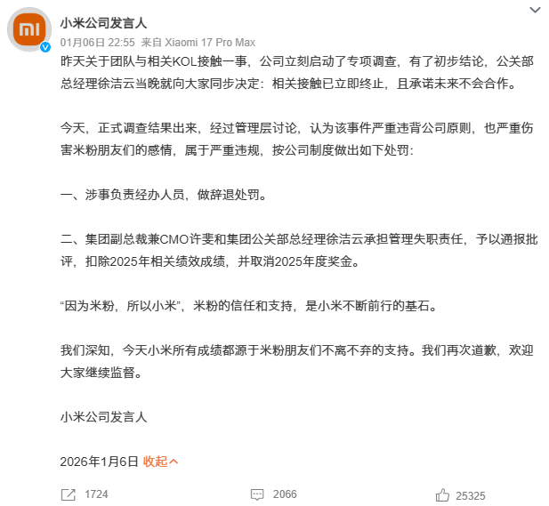 1月6日晚,@小米公司发言人 公布了针对内部团队与特定KOL接触事件的处罚决定。
