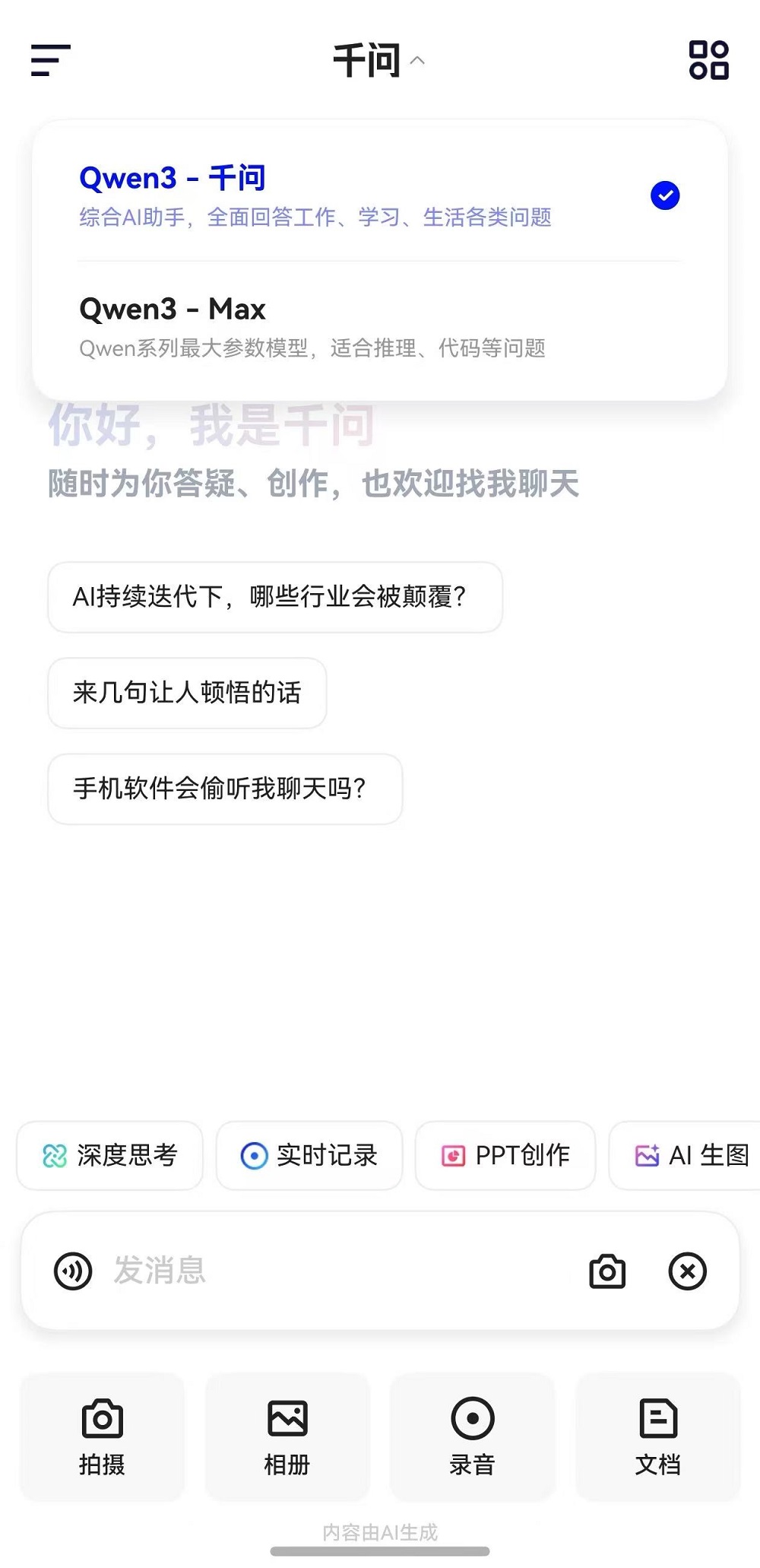千问使用阿里最强闭源Qwen大模型,“聪明会思考”。通过极致优化的简洁界面,让你无门槛地体验到最新AI技术带来的智能升级,旨在成为你在工作、学习、生活中的AI助手。
