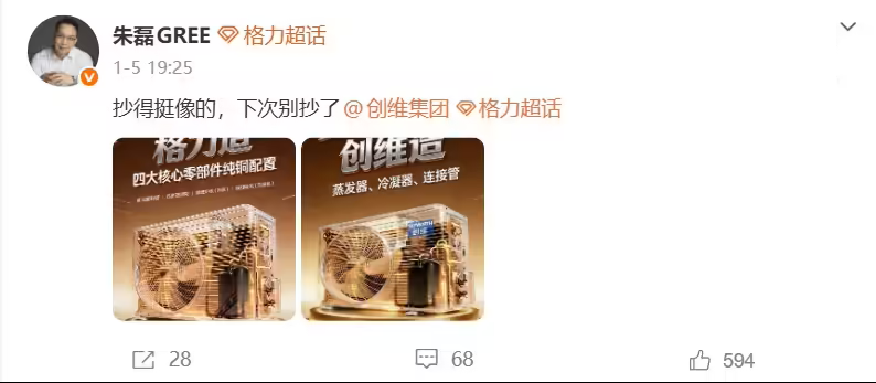 1月5日晚间,珠海格力电器股份有限公司市场总监朱磊在社交平台发布两张对比海报,指出其中一张标注“创维造”的宣传图与格力“真铜实料”主题海报高度相似,并附文“抄得挺像的,下次别抄了”。目前,原由“创维空调”视频号发布的相关海报已被删除。截至发稿,创维方面尚未就此事作出公开回应。