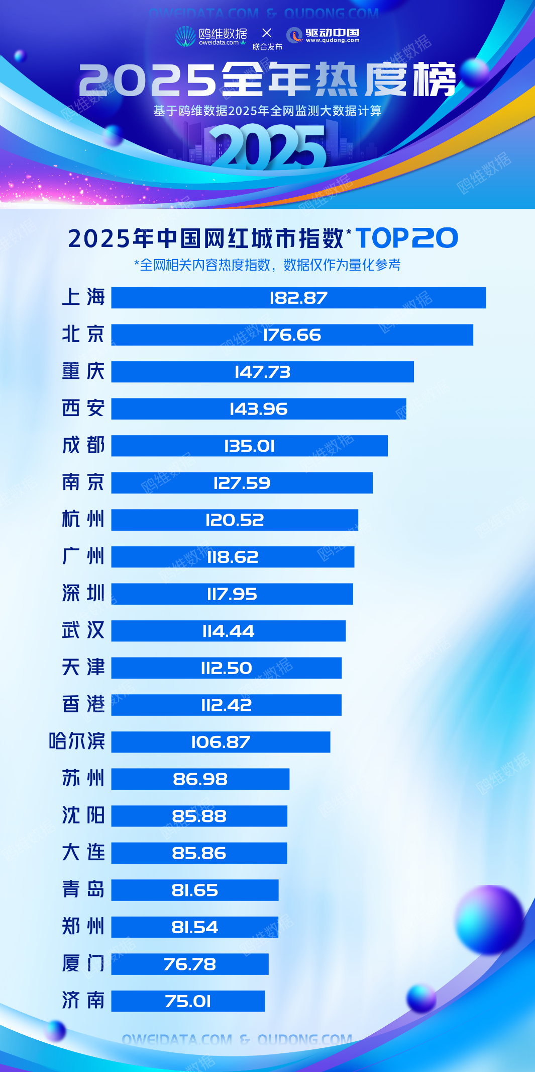 近日,国内知名数据研究平台鸥维数据联合驱动中国发布的【2025全年热度榜】系列子榜单引发全网热议,其中《2025年中国网红城市指数TOP20》榜单凭借全维度的流量监测与专业量化分析,成为解读过去一年中国文旅市场格局的核心样本。