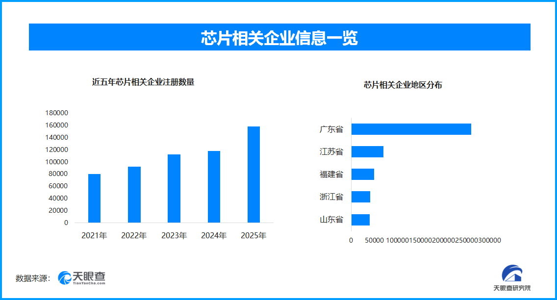 天眼查专业版工商信息数据显示,截至目前我国现存在业、存续状态的芯片相关企业超82.2万家。其中,2025年新增注册相关企业超15.8万余家,从企业注册数量趋势来看,近五年间,芯片相关企业的注册数量呈现出逐年增长的态势,并在2025年达到顶峰。