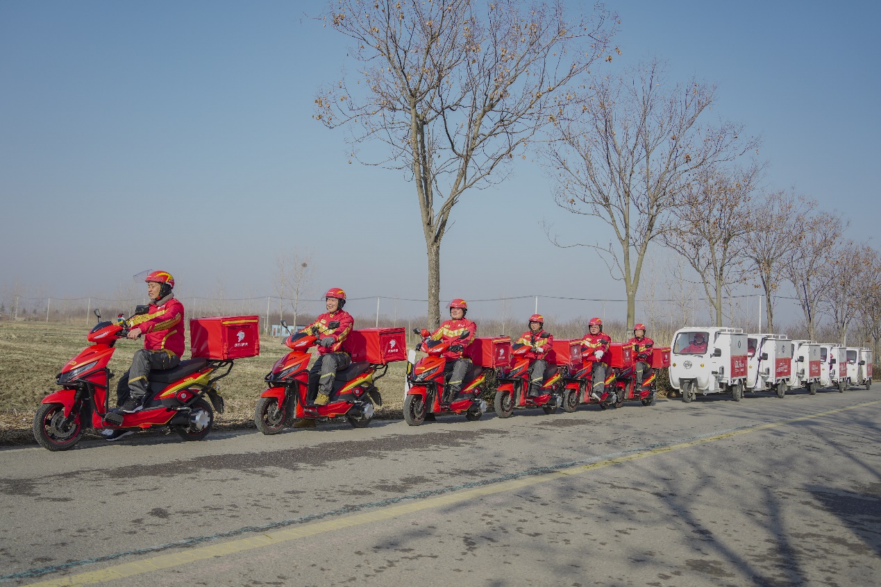 1月28日上午,在江苏省宿迁市来龙镇光明村“我给老家发年货”活动现场,一支由京东全职骑手、快递小哥、家政姐姐自发组成的“混编”服务车队驶入村里,引起众多村民围观。