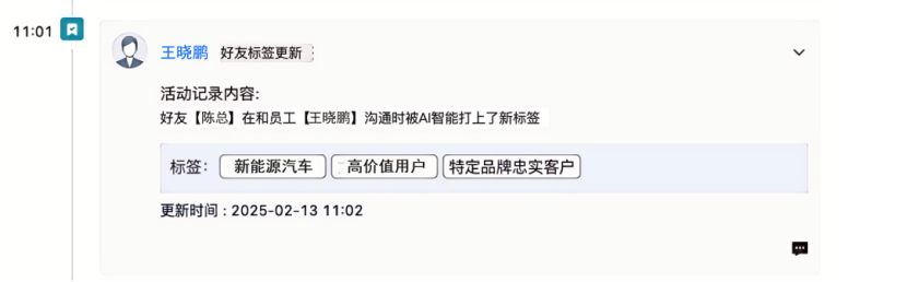 小王顺势用这些热词发起沟通,很快收到陈先生的回复 —— 对方对油车换电车活动表现出浓厚兴趣。企微会话 Agent 随即自动识别会话内容,为陈先生新增 “新能源汽车” 标签。