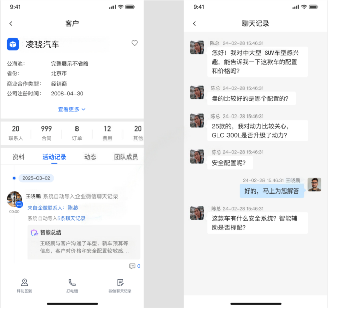 小王点开企微侧边栏查看客户画像、标签,发现陈先生名下已有轿车、SUV 两款油车,且对价格不敏感;结合沟通内容,他立刻判断出客户的核心需求是置换旧油车、升级新能源车。于是,小王针对性推荐了一款新上市的高端新能源 SUV,同时发送详细的油车置换补贴政策,精准戳中客户痛点。