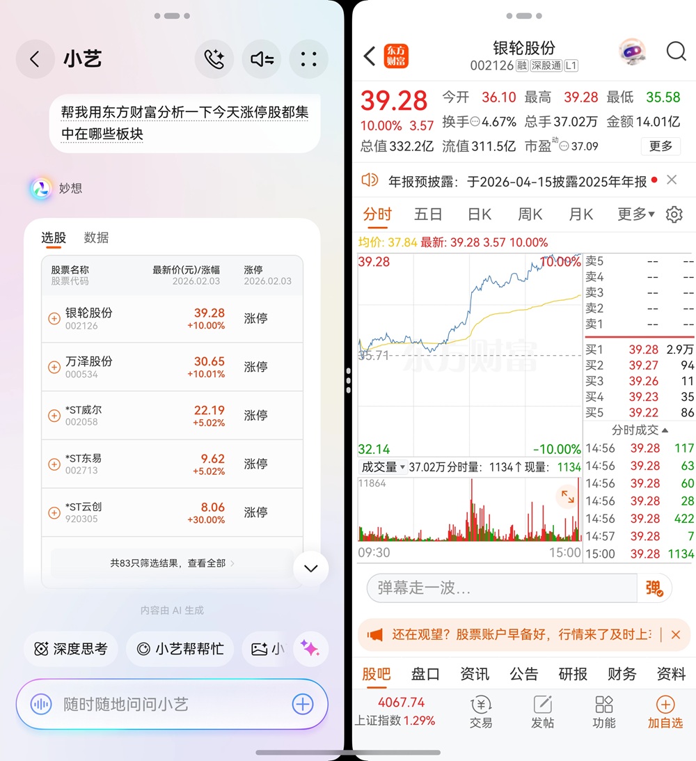 得益于双折叠屏手机开阔的视野和独特的双屏交互,投资者可以通过小艺语音助手唤起“妙想智能体”进行股票查询,轻松实现“左侧问股、右侧交易”的便捷操作。例如,用户只需对小艺说“用东方财富帮我看一下今天涨停股集中在哪些板块”,小艺便会通过智能体列出相关板块及涨停情况;点击任意板块,右侧屏幕即可直接跳转至该板块的行情页面,而左侧屏幕仍可继续交互,供投资者进一步提问。这样一来,以往需要在多个设备或应用间反复切换的操作,如今只需在掌上方寸之间轻触屏幕,便能从容实现边查询边交易的一体化体验。