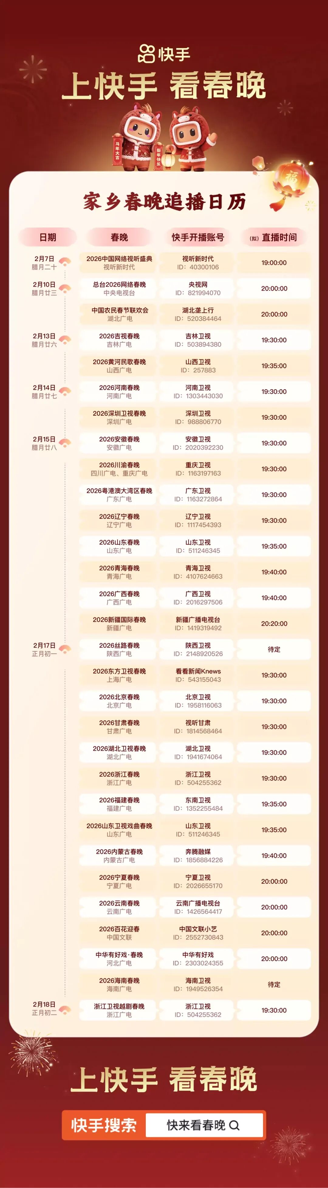 与此同时,快手还将联动全国20余个省、市、自治区的地方春晚内容,包括辽宁卫视、湖南卫视、河南卫视、四川卫视等具有鲜明地域特色的春节联欢晚会,形成“中央+地方”双轮驱动的内容矩阵。官方已发布完整追播日历,覆盖从腊月廿三至正月十五的全周期节日内容,真正实现“天天有春晚,处处有年味”。