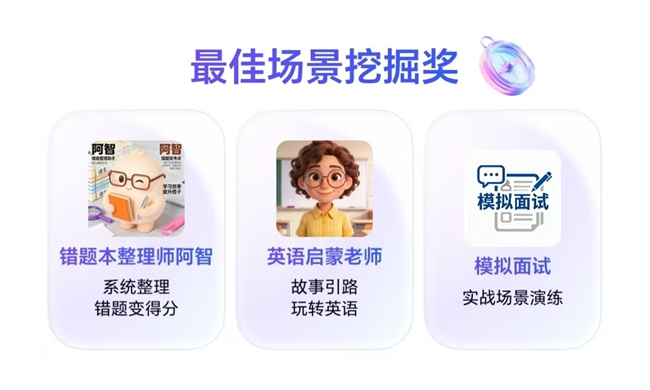 最佳场景挖掘奖单元的作品,更兼顾创意与实用性。《错题本整理师阿智》聚焦学习辅助建立错题管理体系,形成可复用的学习资产;《英语启蒙老师》在趣味游戏和生动故事中,沉浸式轻松学英语;《模拟面试》体验全品类岗位面试设计与评估,为用户高效提升面试技巧。