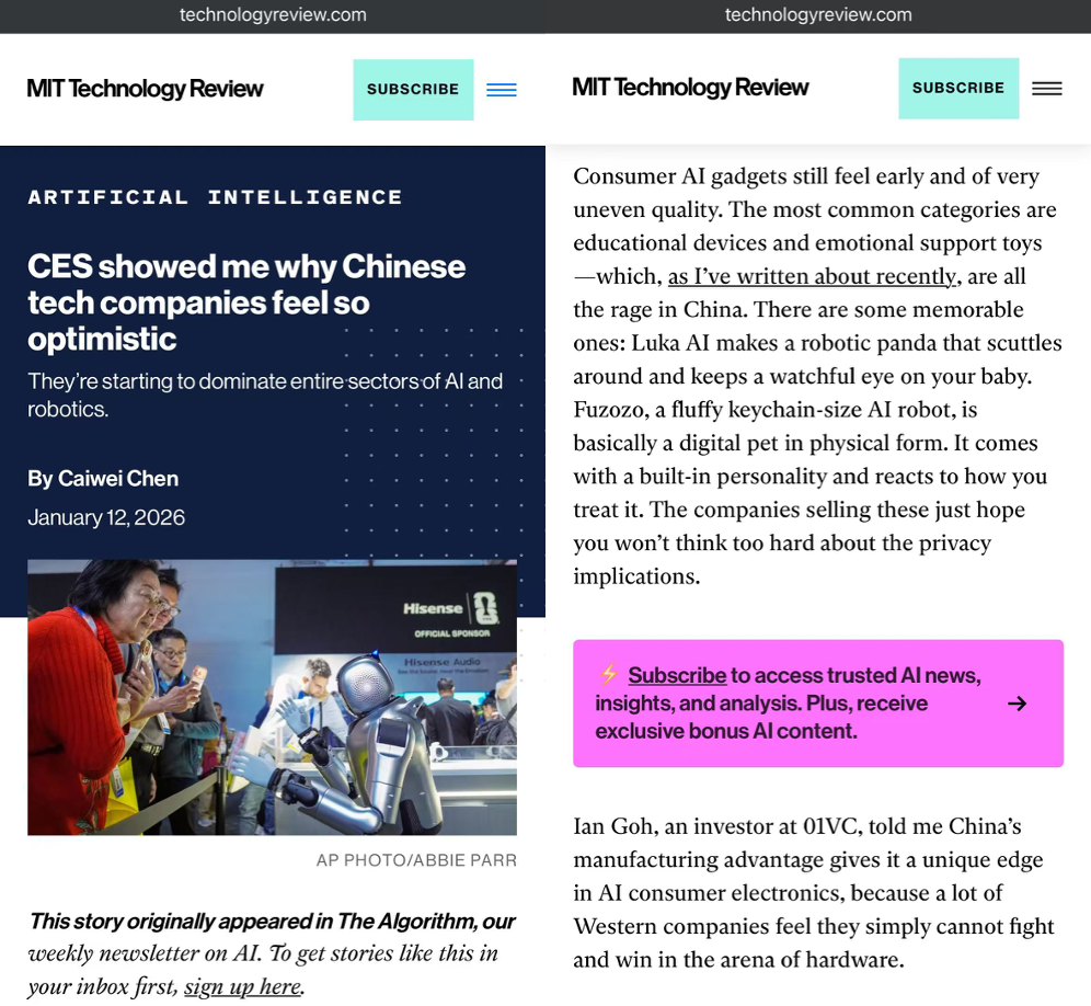 MIT Technology Review(麻省理工科技评论)在题为《AI devices, humanoid robots—Chinese companies dominate CES 2026》的深度报道中,也将灵宇宙作为案例;The Verge也在多平台发布现场测评视频。小方机被评价为“针对年轻人的袖珍智能设备的新形式”(pocket-sized smart device targeted for kids)。